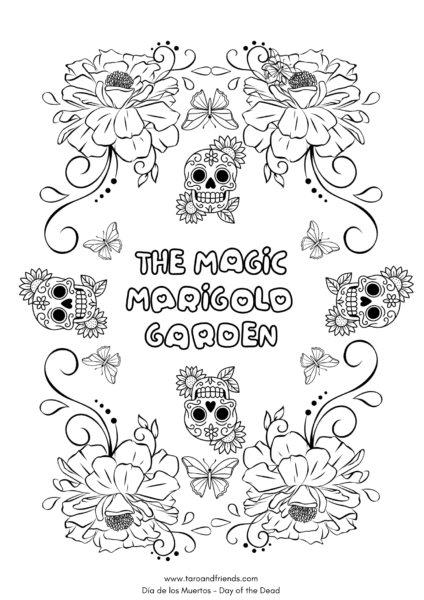 Our second page features Taro & Friends in a garden full of beautiful marigolds inspired by Día de los Muertos!